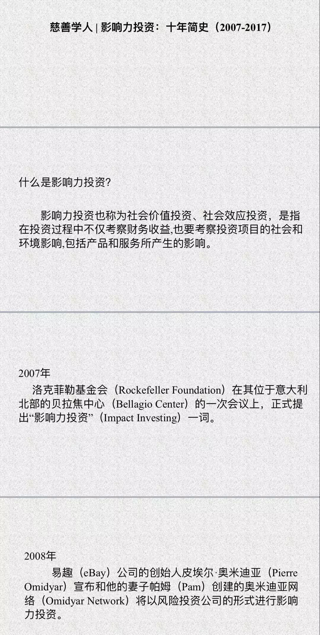 “影响力投资”(Impact Investing)一词,是美国洛克菲勒基金会(Rockefeller Foundation)2007年在意大利第一次正式提出。