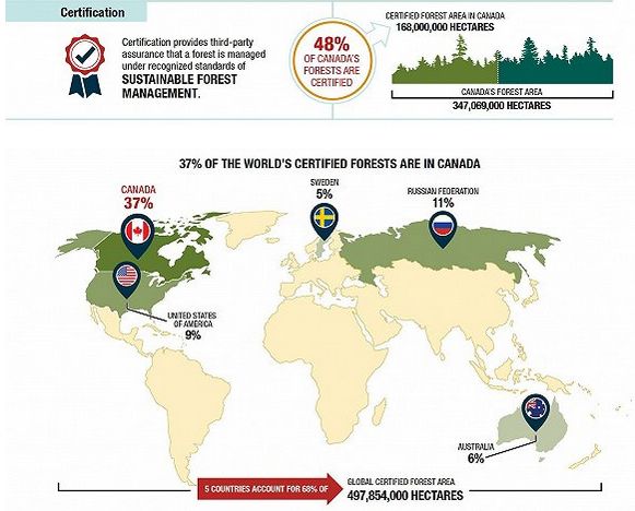 环保组织抗争的积极成效之一,是推动了加拿大森林认证。森林认证又称森林可持续经营认证,是一种由独立第三方进行的、旨在促进或保障森林可持续经营的市场机制。它包括森林经营认证和产销监管链认证,前者根据一系列的原则、标准、指标和程序,对森林经营业绩进行认证,后者则是对木材产业的各个环节进行认证。