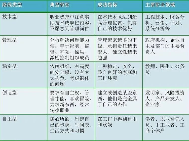 同时人还有五种择业喜好,即技术型、管理型、创造型、自由型和安稳型。安稳型的人喜欢安全感,比如可能因为喜欢在熟悉的环境工作或学习而放弃在别的城市或别的公司更好的事业发展的机会;自由型的人喜欢把握自己的人生,适合创业或在大学里做教授;技术型的人喜欢在一个专业里做大、做强,适当做某个领域的专家;管理型的人喜欢做职业经理人,他们职涯的终极目标就是做CEO或高管;创造型的人喜欢富有创意的工作,适合当建筑设计师、品牌设计师等。
