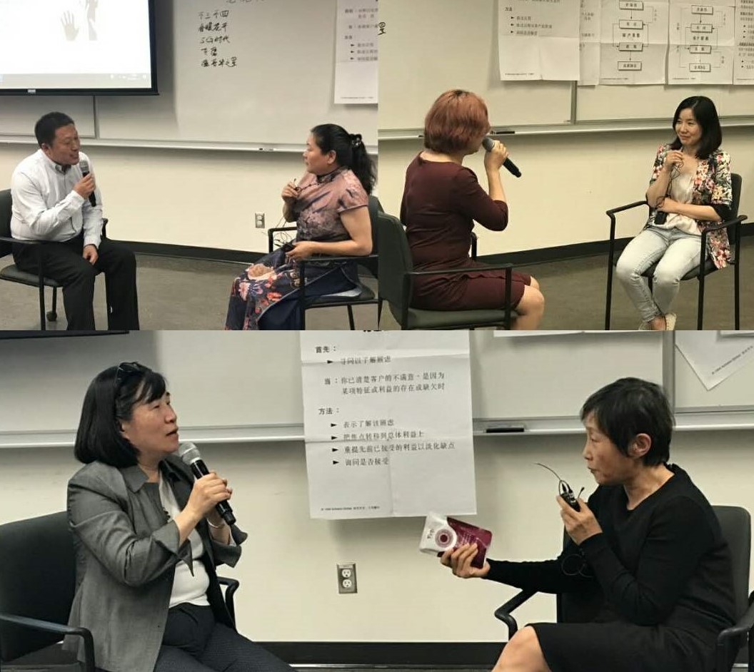 一对一的情景演练将集训推向了另一个高潮!设计场景,用EPAQ方法询问,三分钟的展示,自我点评,对手点评,老师点评……一个个环节让大家恍然大悟,获益匪浅。不一样就是不一样!