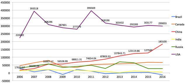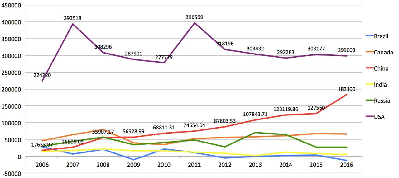 从对外投资的存量数据(即历年的累计投资总额)来看,由于中国对外投资从2001开始才呈现突飞猛进的增长趋势,与美国的差距较大,但有缩小的趋势。2006年美国对外投资的存量额是中国的60倍,而截至2016年,差距缩小至5倍。中国在2015年对外投资存量与加拿大相当,并在2016年以1万2千亿美元的存量额超过加拿大。
